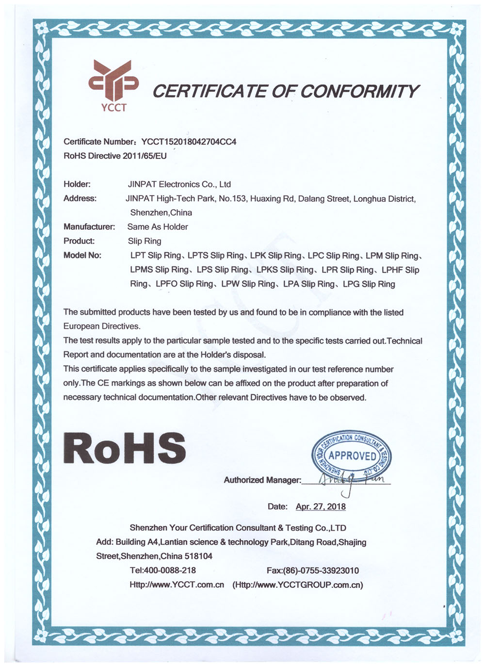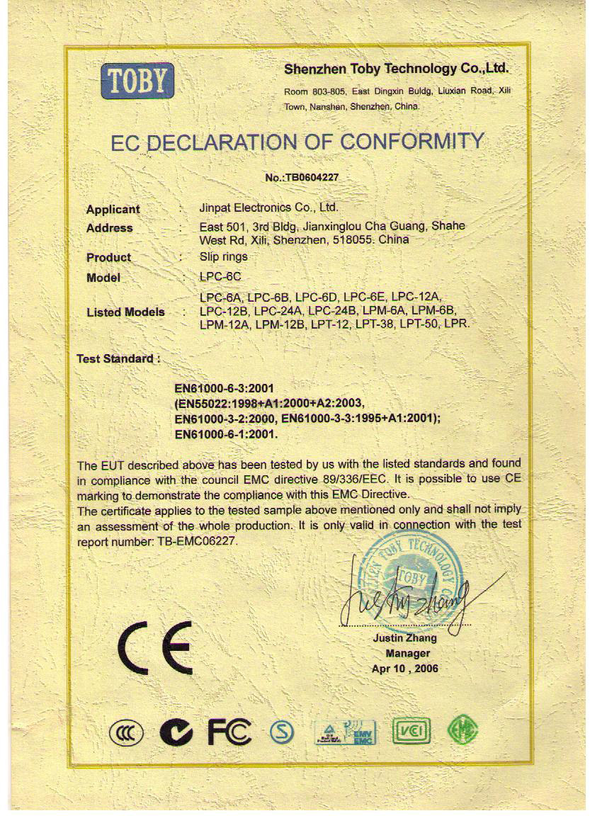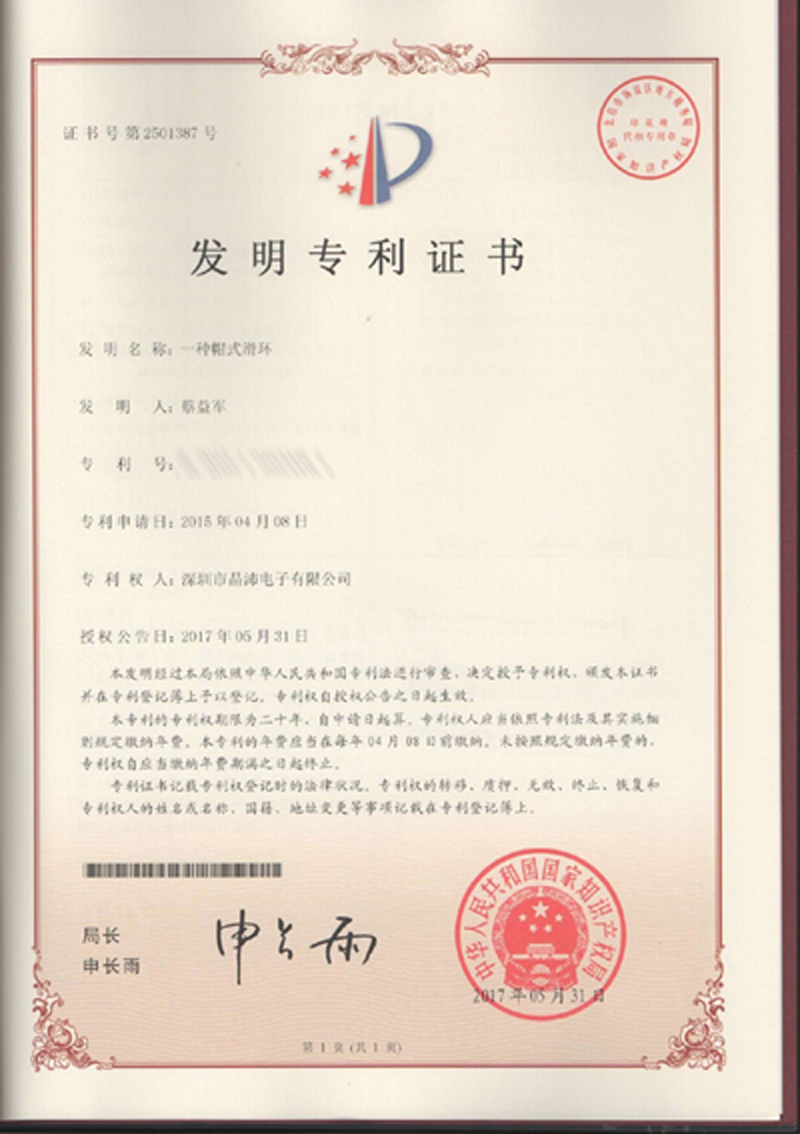 晶沛通過(guò)了歐盟CE認(rèn)證守口如瓶、FCC認(rèn)證平平凡凡、SGS認(rèn)證放马后炮、BV“船級(jí)社”認(rèn)證、防爆認(rèn)證等多項(xiàng)認(rèn)證,生產(chǎn)的導(dǎo)電滑環(huán)都符合RoHS環(huán)保要求,先后被授予“國(guó)家高新技術(shù)企業(yè)”稱(chēng)號(hào),目前已獲得45項(xiàng)專(zhuān)利,其中發(fā)明專(zhuān)利6項(xiàng)。